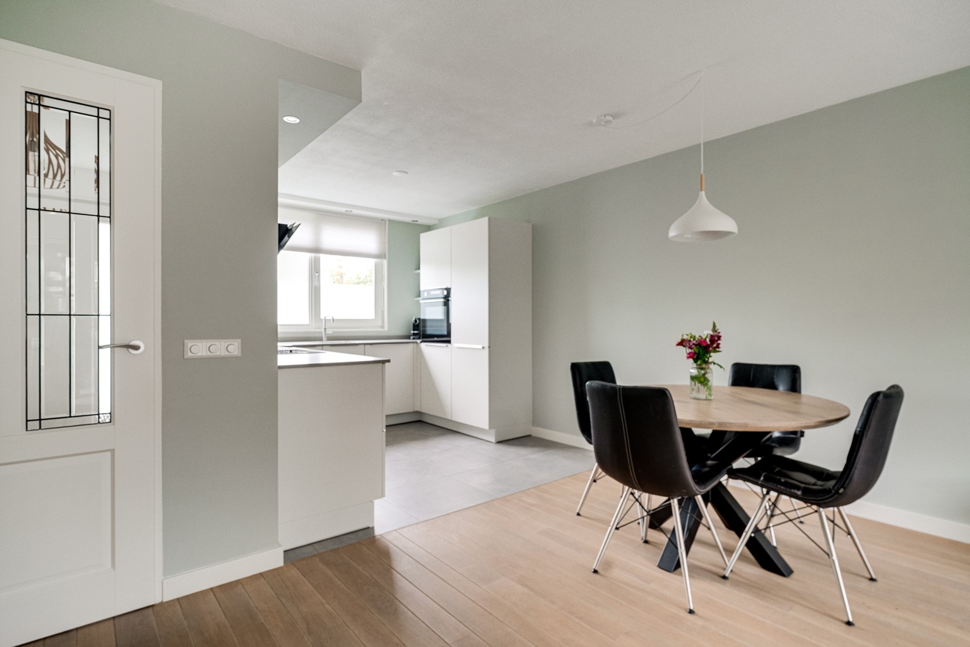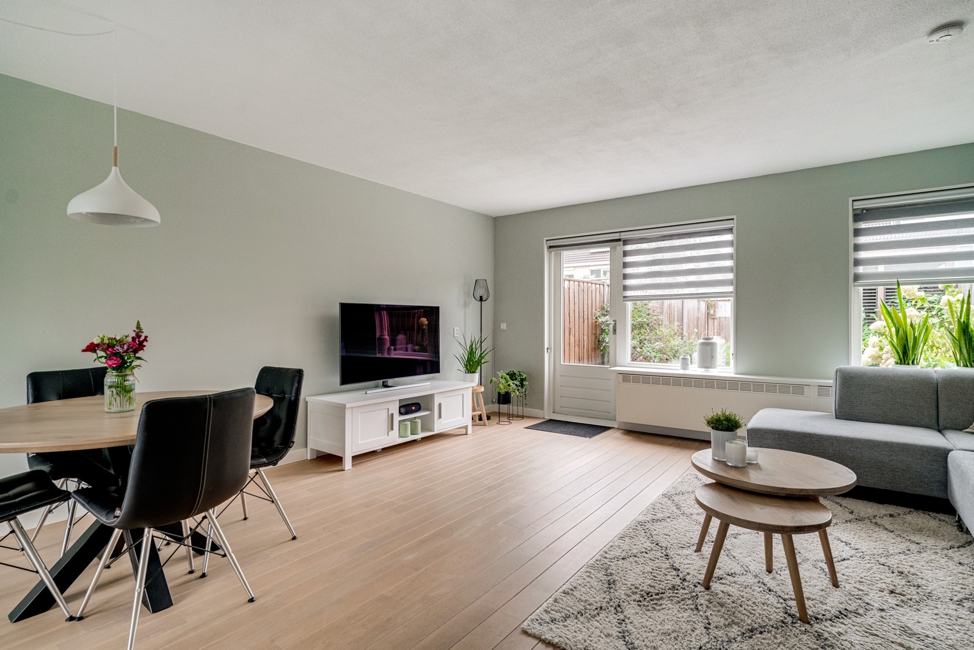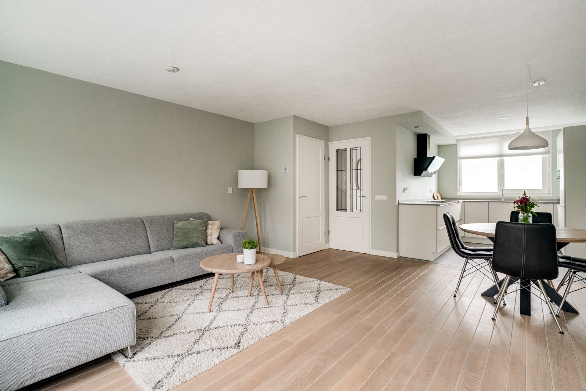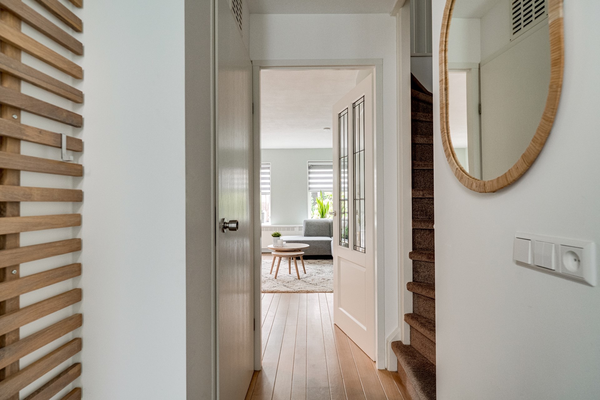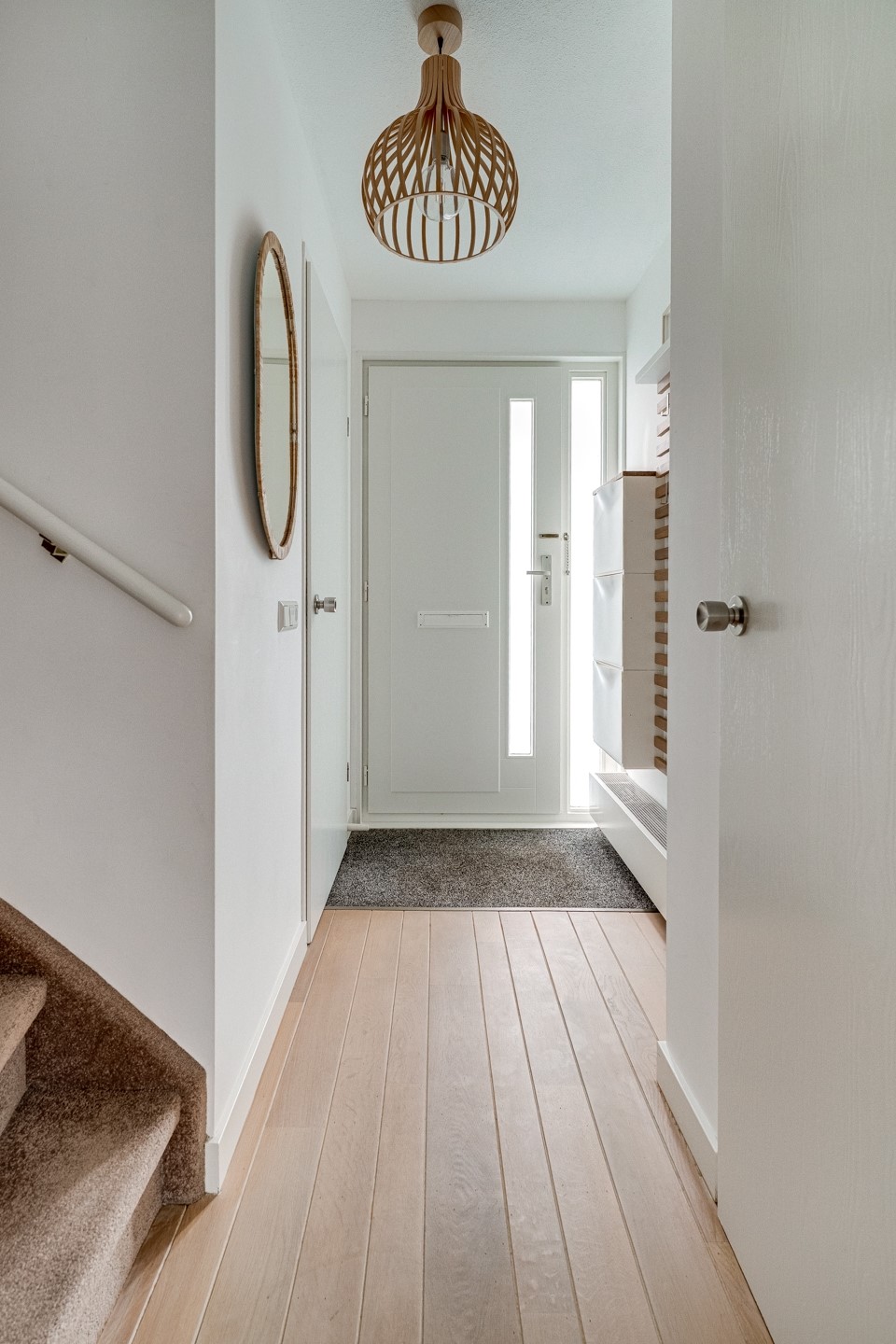 Entree via de hal met meterkast, trapopgang en vernieuwde toiletruimte v.v. hangend toilet met geurafzuiging, fontein en inbouwkast. Aan de voorzijde is de keurige keuken gelegen, welke is uitgerust met diverse inbouwapparatuur zoals een vaatwasser, koel-vriescombinatie, combi oven, 4-pits inductiekookplaat, afzuigkap en Quooker. De lichte woonkamer is aan de achterzijde gelegen en v.v. een luxe massief houten vloer en een ruime trapkast.