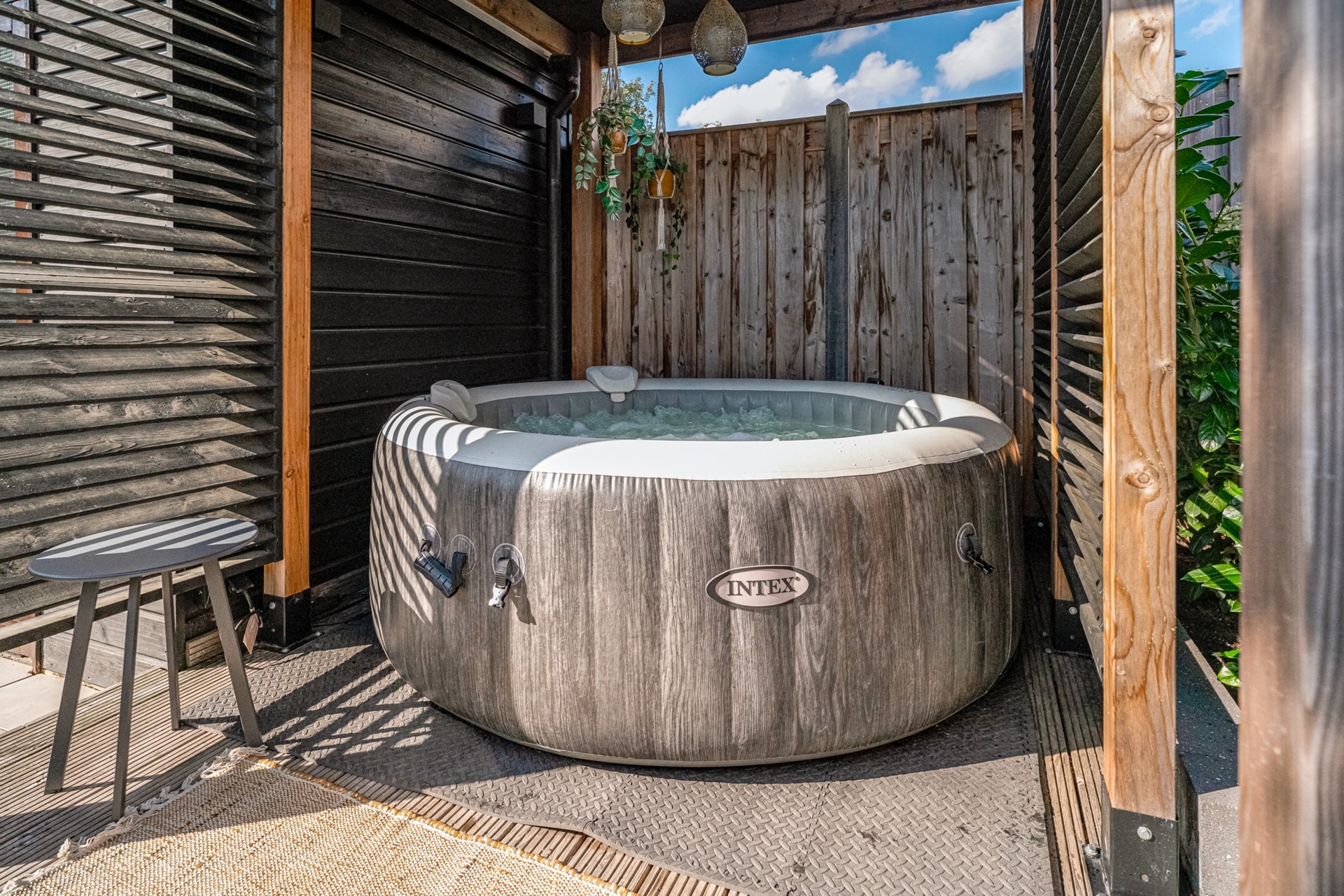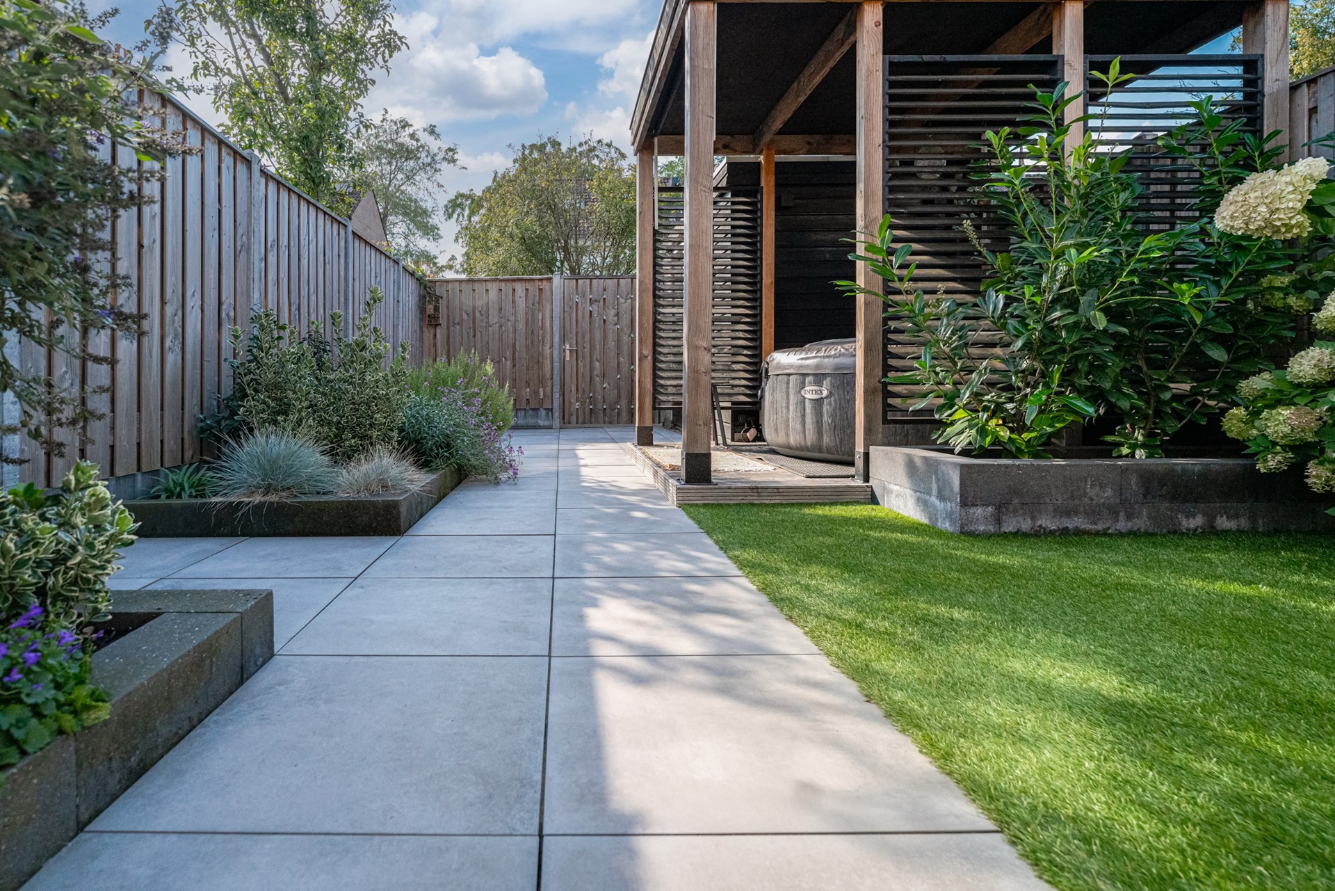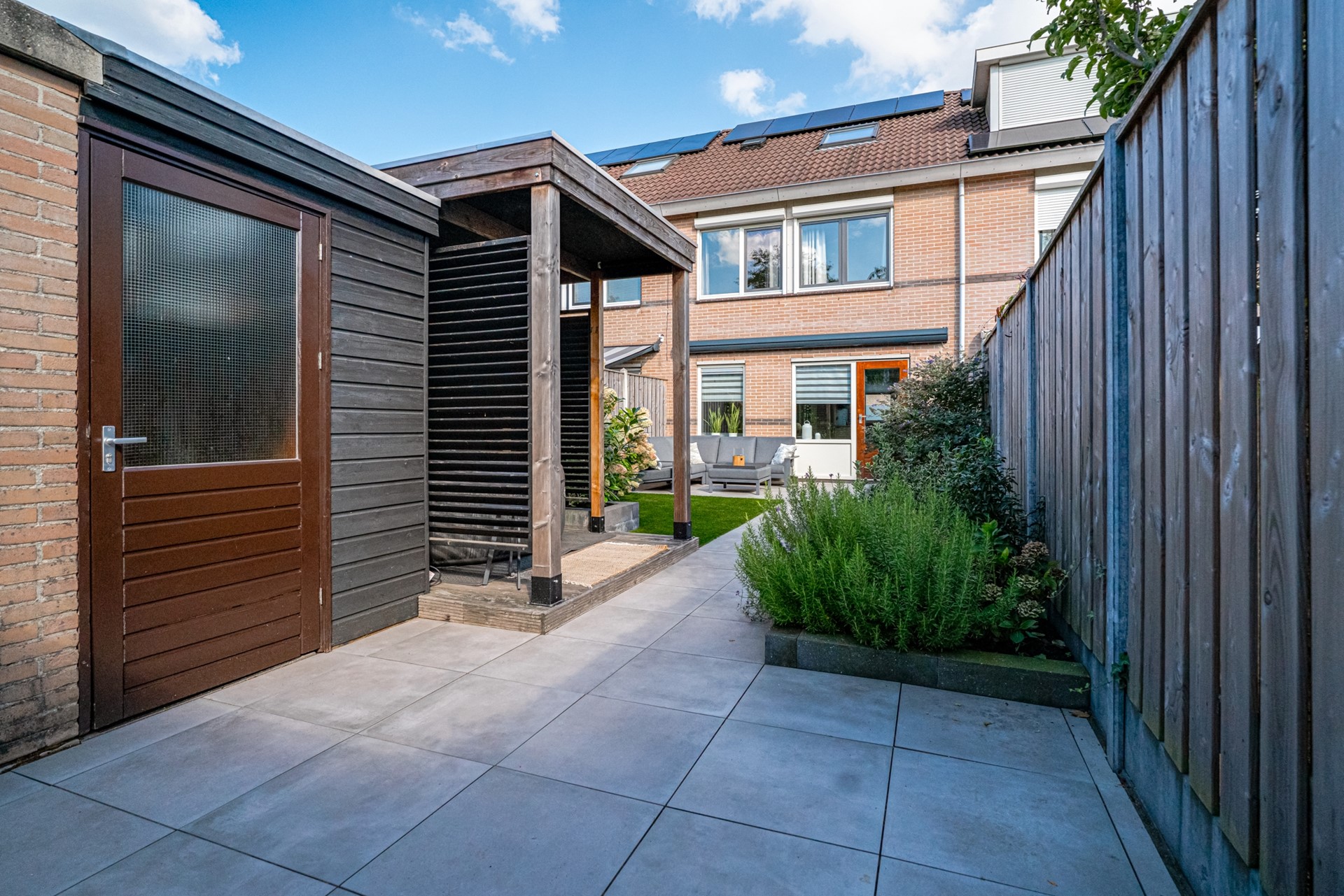Via de woonkamer kom je uit in de recent gerenoveerde gezellige achtertuin. De achtertuin is op het westen gelegen en beschikt over een elektrisch zonnescherm (ter overname), ruime achterom, dubbele berging v.v. elektra en een overkapping met een opblaasbare jacuzzi (ter overname).