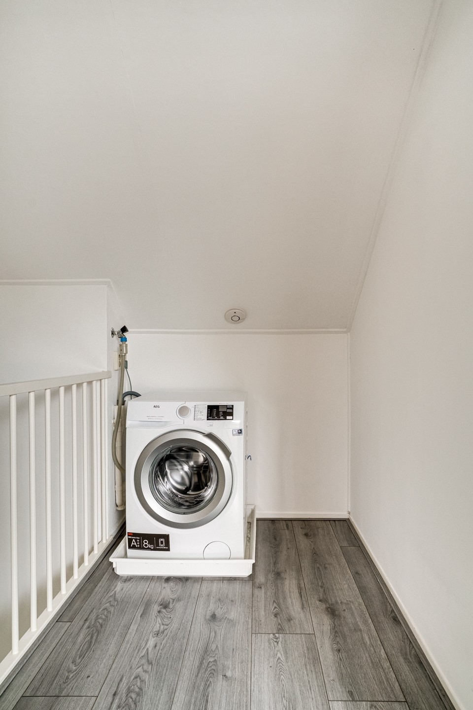 Voorzolder met wasmachine– en drogeraansluiting en toegang tot de vierde ruime slaapkamer welke is voorzien van bergschotten en twee dakramen.