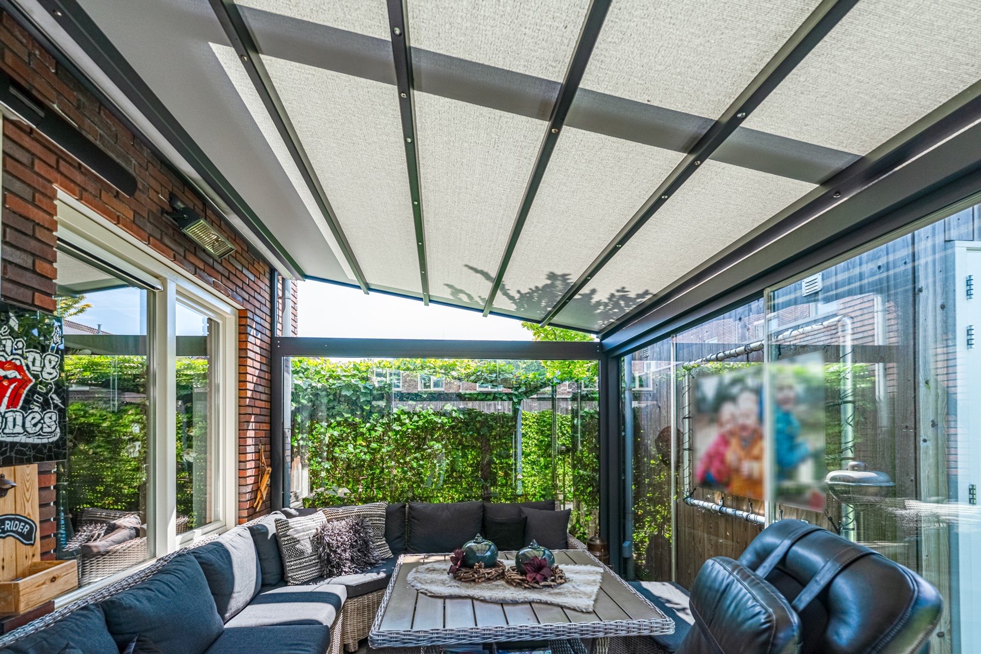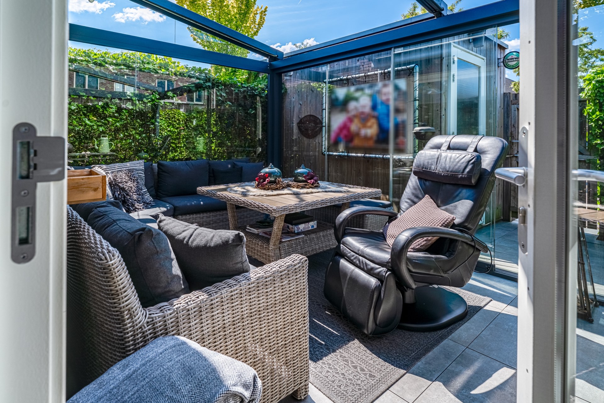 De zonnige achtertuin is op het westen gelegen en uitgerust met een vrijstaande houten berging en een luxe terrasoverkapping met glazen schuifwanden, waterdicht schuifdak, spots en heathers.
