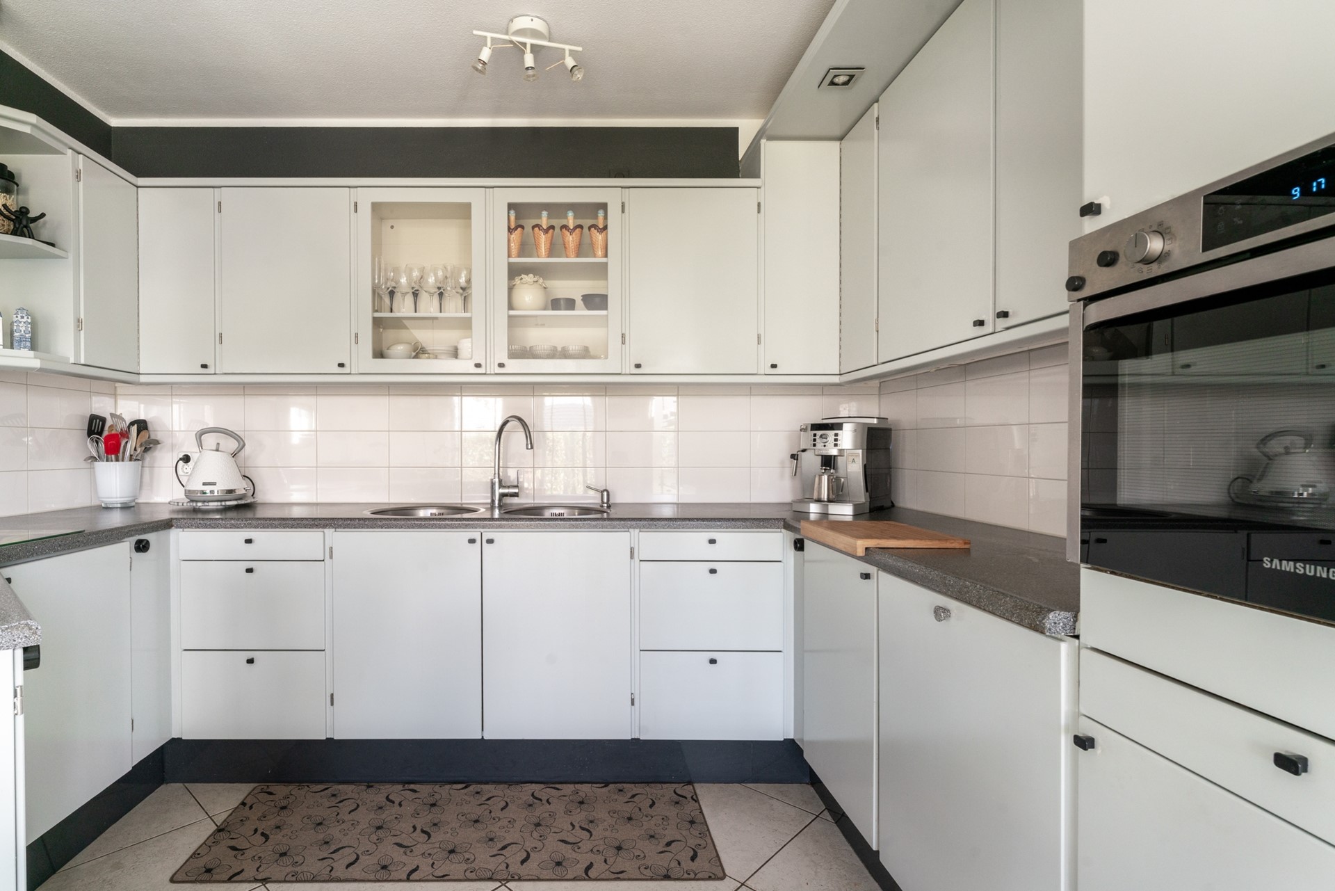 Hal met toilet v.v. fontein, trapopgang en meterkast met 3-fase aansluiting en glasvezelaansluiting. Lichte, royale woonkamer met tegelvloer en diverse raampartijen. Aan de achterzijde is de keuken gelegen, welke is uitgerust met diverse inbouwapparatuur zoals een vaatwasser, combi oven, 4-pits inductiekookplaat en koelkast. Via de keuken kom je uit in de ruime en zonnige achtertuin, welke op het zuidoosten is gelegen, met een vrijstaande houten tuinberging v.v., elektra.