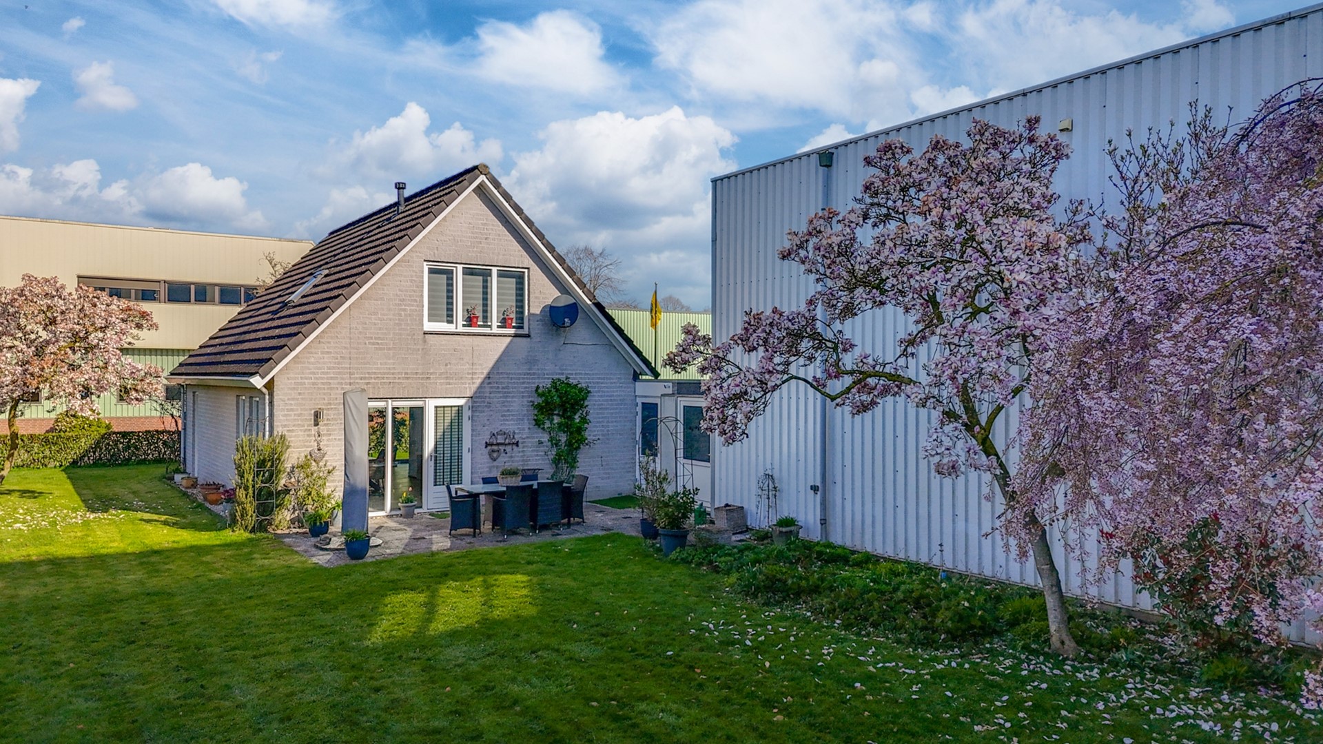 Op eigen perceel is er de gelegenheid tot het parkeren van ca. 8 auto’s. Daarnaast is er een aangebouwde stenen garage aanwezig met cv-opstelling, wasmachine-/drogeraansluiting en verwarming. De multifunctionele loods beschikt over een elektrische roldeur, krachtstroom, toiletgroep, keuken en een kantoor.
