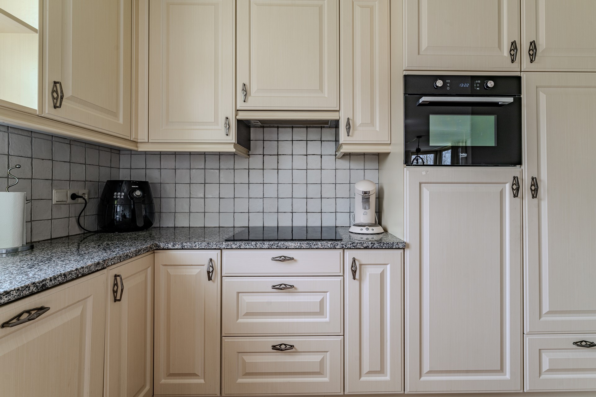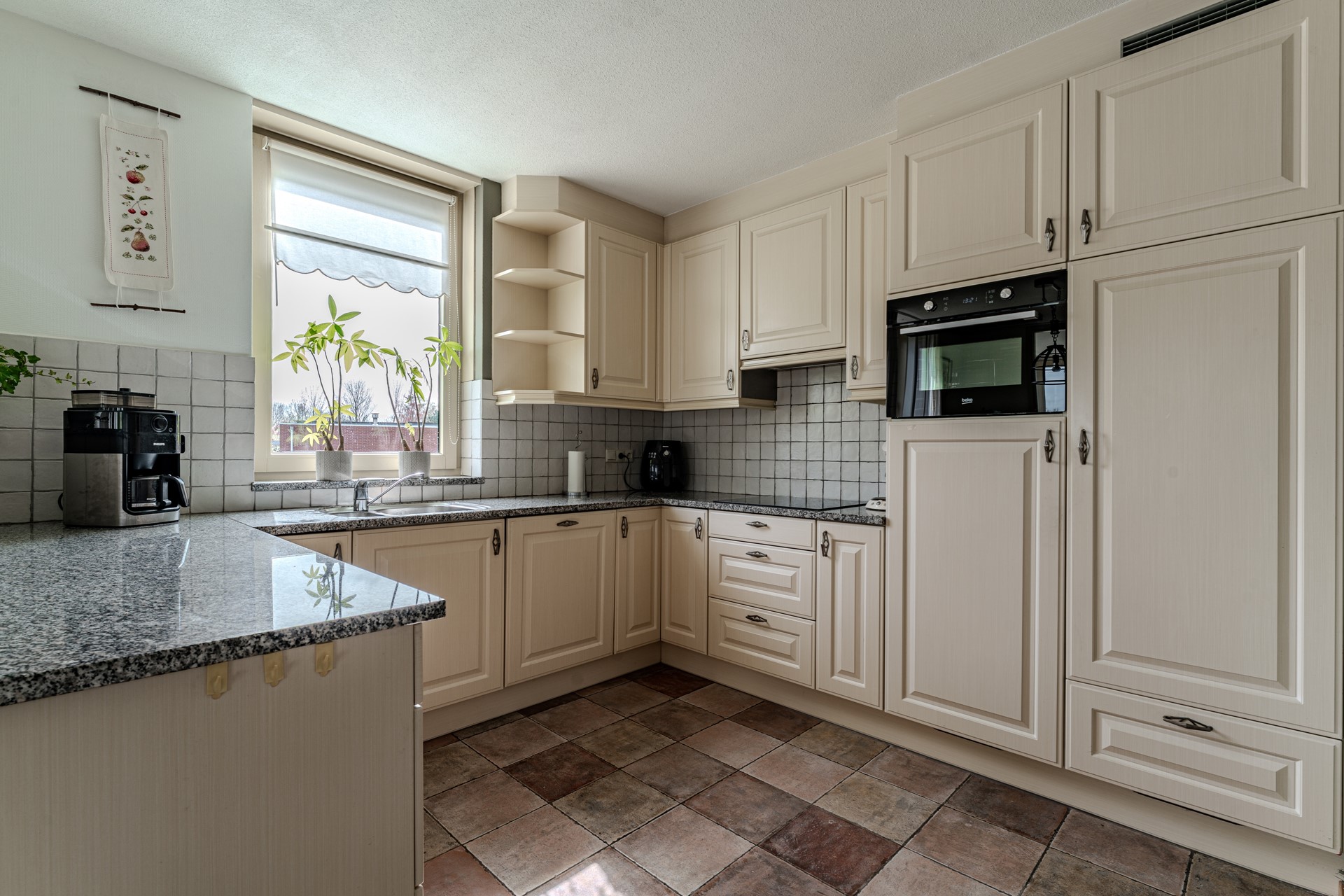 De open keuken met kookeiland beschikt over diverse inbouwapparatuur zoals een vaatwasser, koelkast, vriezer, combi oven en 4-pits keramische kookplaat.