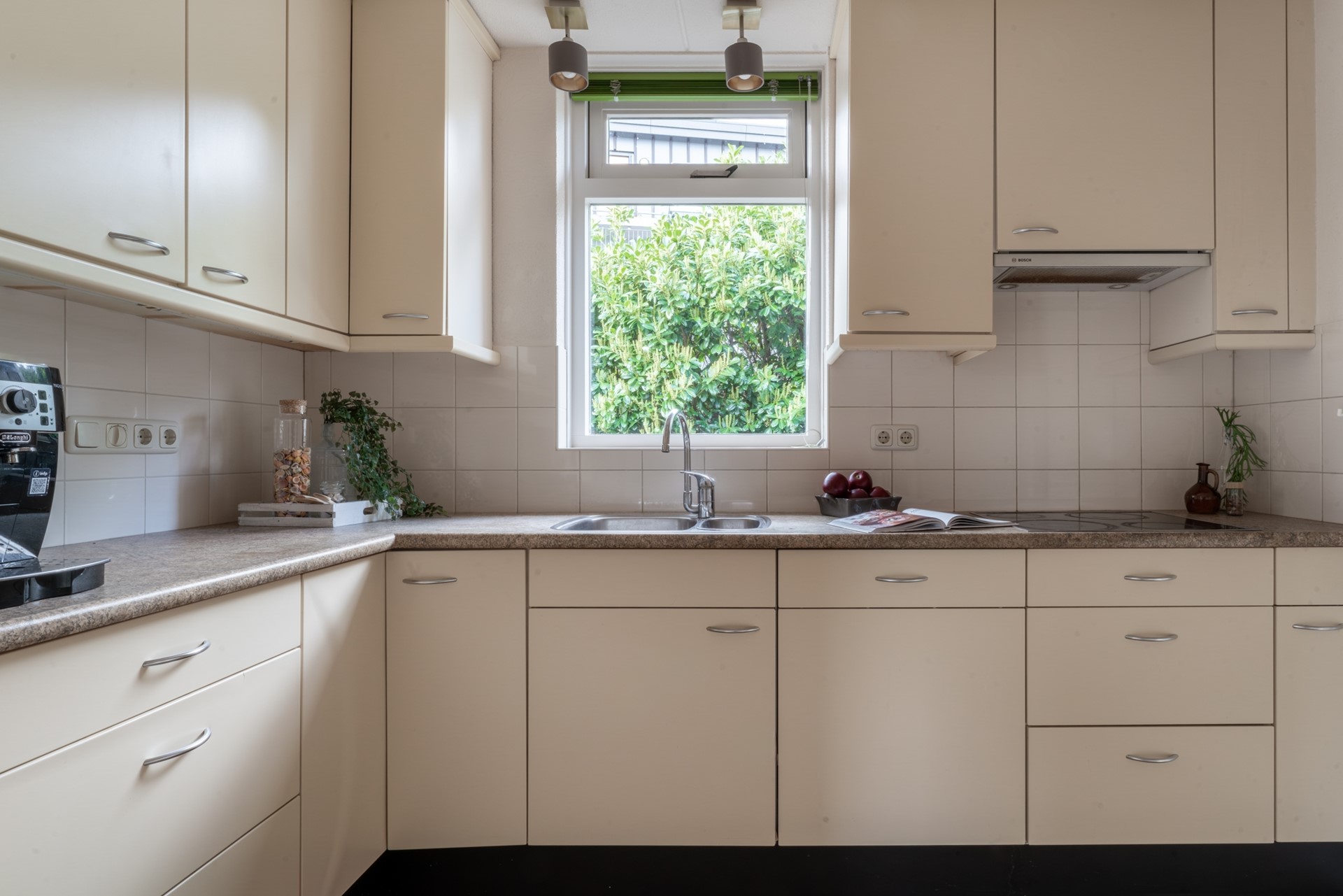 Aan de voorzijde is de lichte woonkamer met screens gelegen, welke toegang biedt tot de keuken. De keuken is uitgerust met diverse inbouwapparatuur zoals een vaatwasser (2025), koelkast, vriezer, combi oven en 4-pits keramische kookplaat. Aansluitend de bijkeuken met wasmachine-/drogeraansluiting en de verdeler van de vloerverwarming.