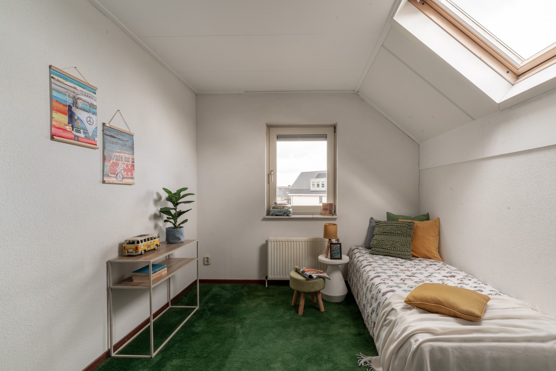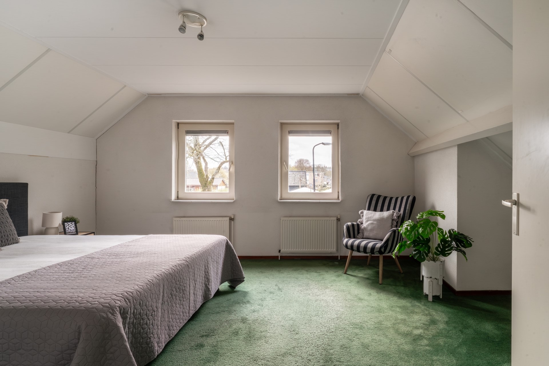 Royale overloop met cv-opstelling en bergschotten. Op de eerste verdieping is de tweede badkamer gelegen, welke is voorzien van douchehoek, derde toilet en wastafel. Aan de achterzijde zijn twee volwaardige slaapkamers met dakramen gelegen en aan de voorzijde is de riante master bedroom met bergschotten te vinden.