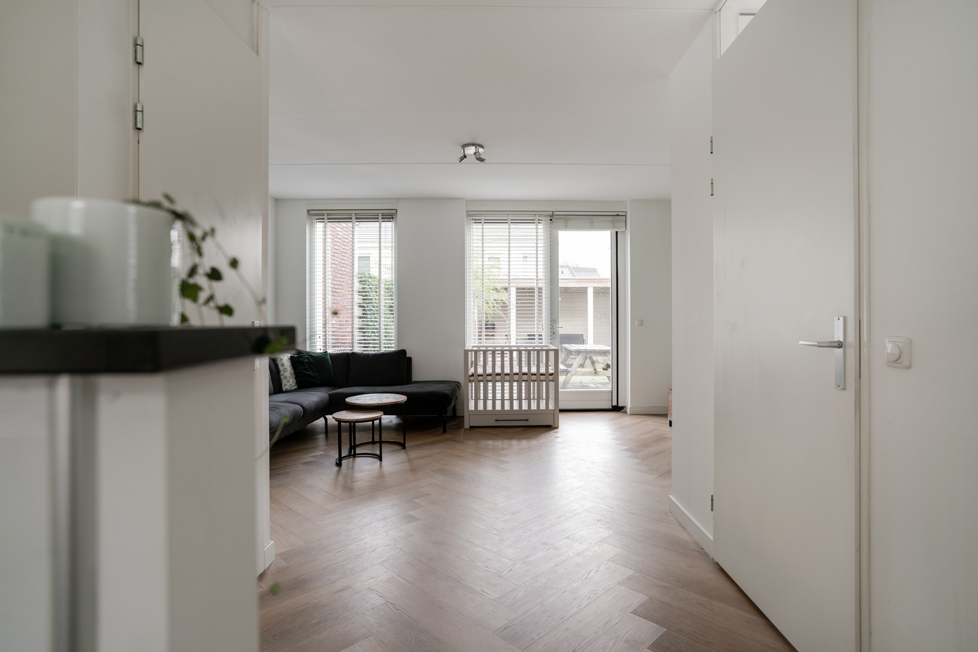 Entree via hal met toilet v.v. fontein en een meterkast v.v. 3-fase en glasvezelaansluiting. De nette keuken is aan de voorzijde gelegen en is uitgerust met diverse inbouwapparatuur zoals een vaatwasser (2024), koel-/vriescombinatie, combimagnetron en 4-pits inductiekookplaat. Aan de achterzijde is de lichte woonkamer gelegen, met een trapkast en toegang tot de achtertuin.