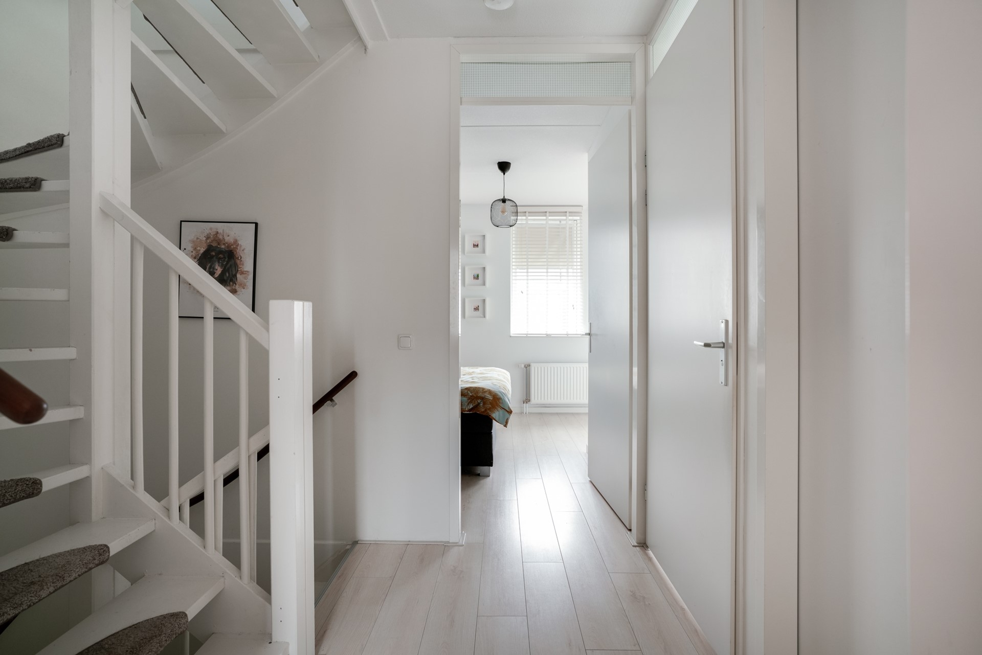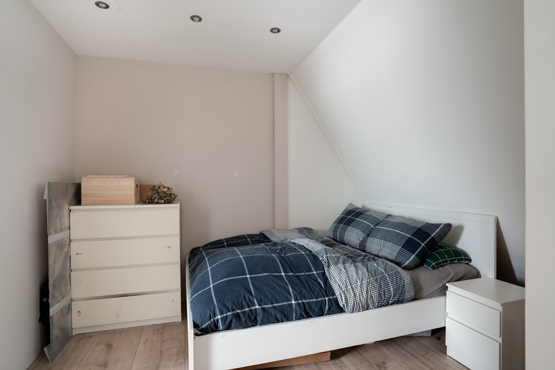 Voorzolder met knieschotten, wasmachine-/drogeraansluiting en toegang tot de opbergvliering. Ruime, vierde slaapkamer met Velux dakraam.