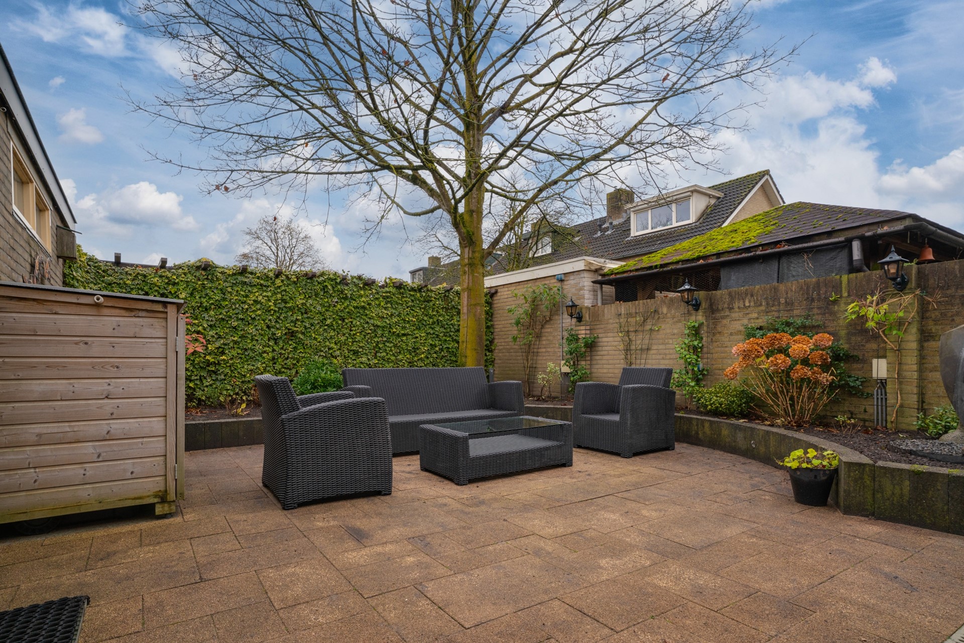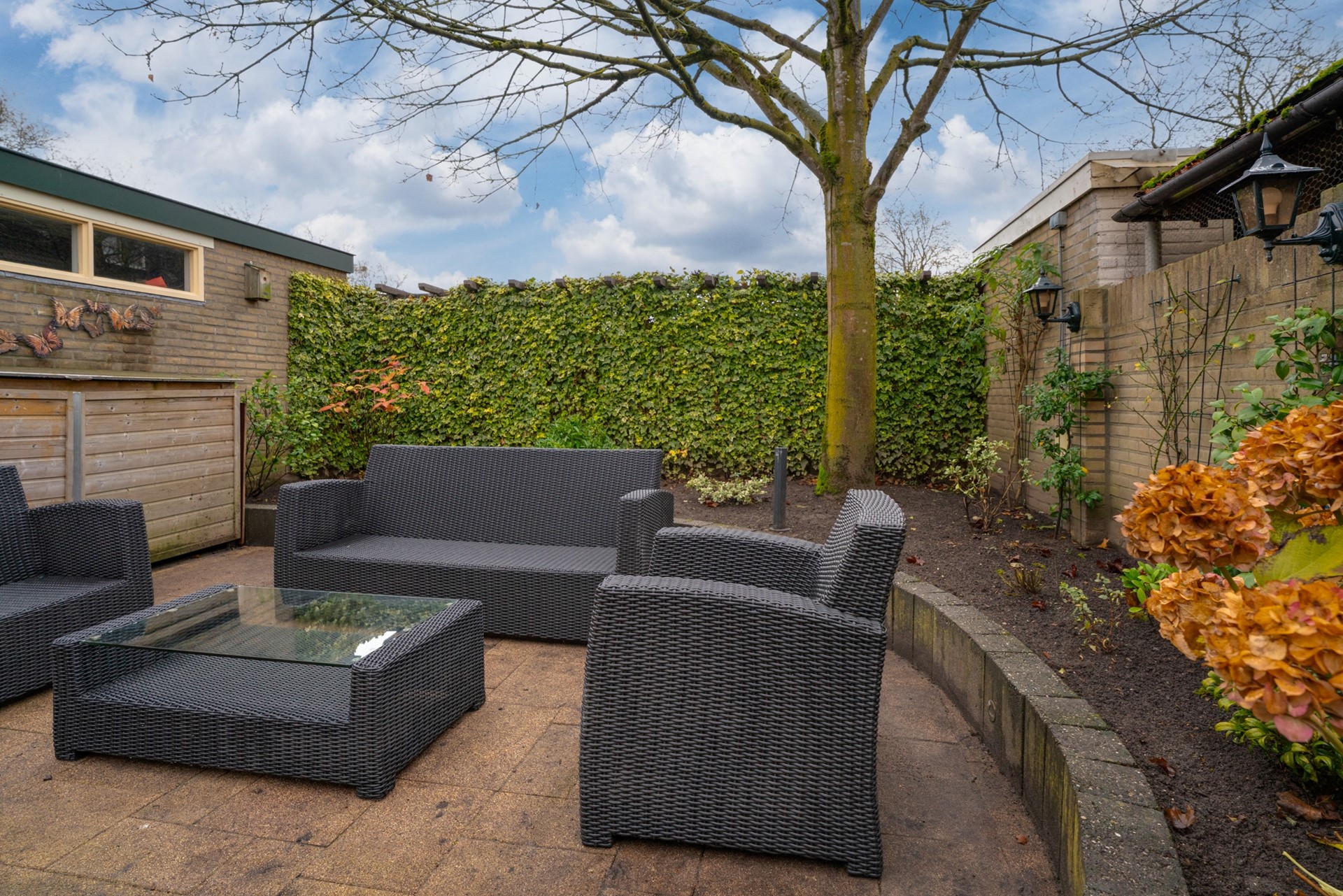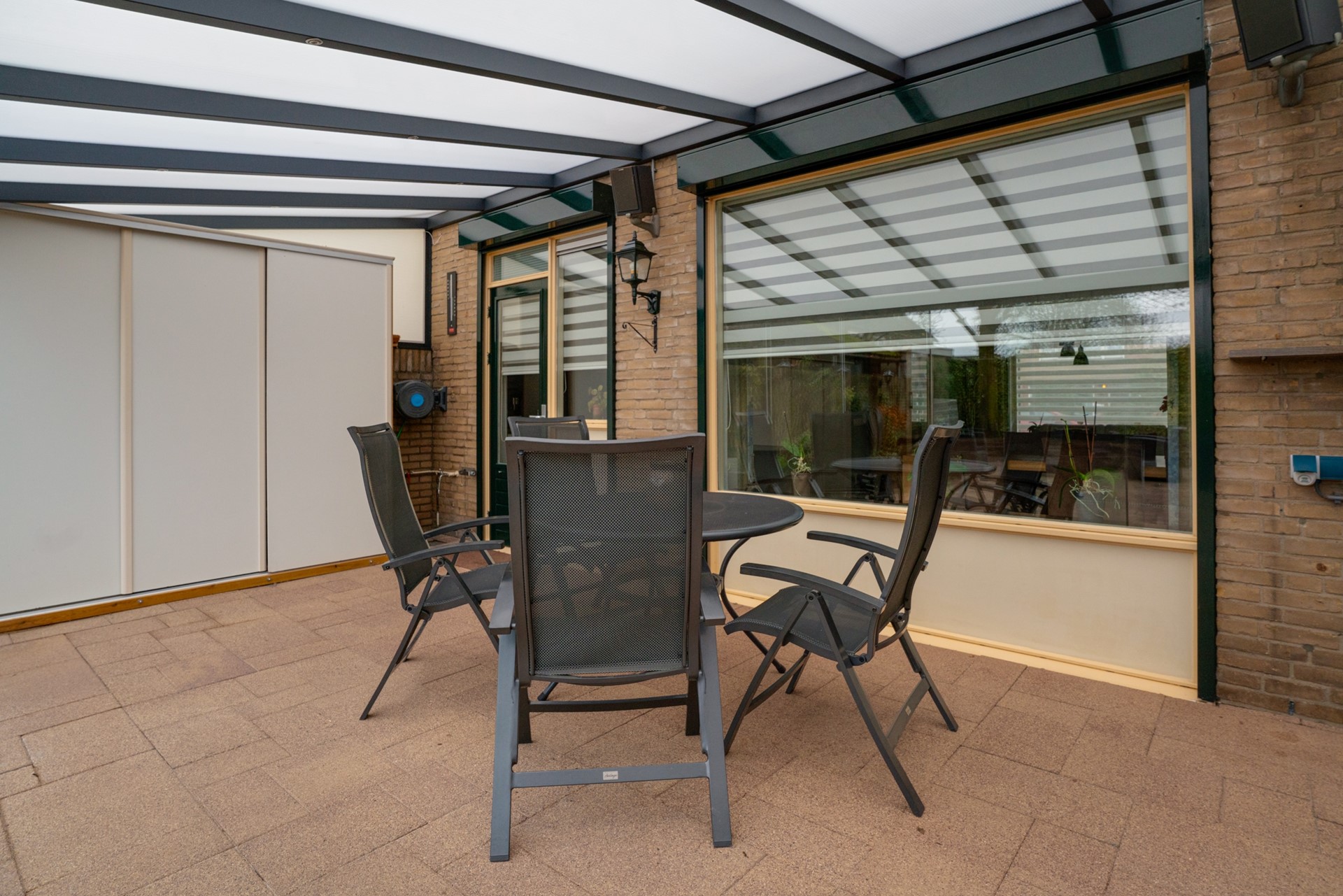 Via de keuken kom je uit in de op zuiden gelegen achtertuin. De achtertuin biedt veel privacy en is uitgerust met vrijstaande stenen berging/garage met elektra en een luxe terrasoverkapping v.v. glazenschuifwand.