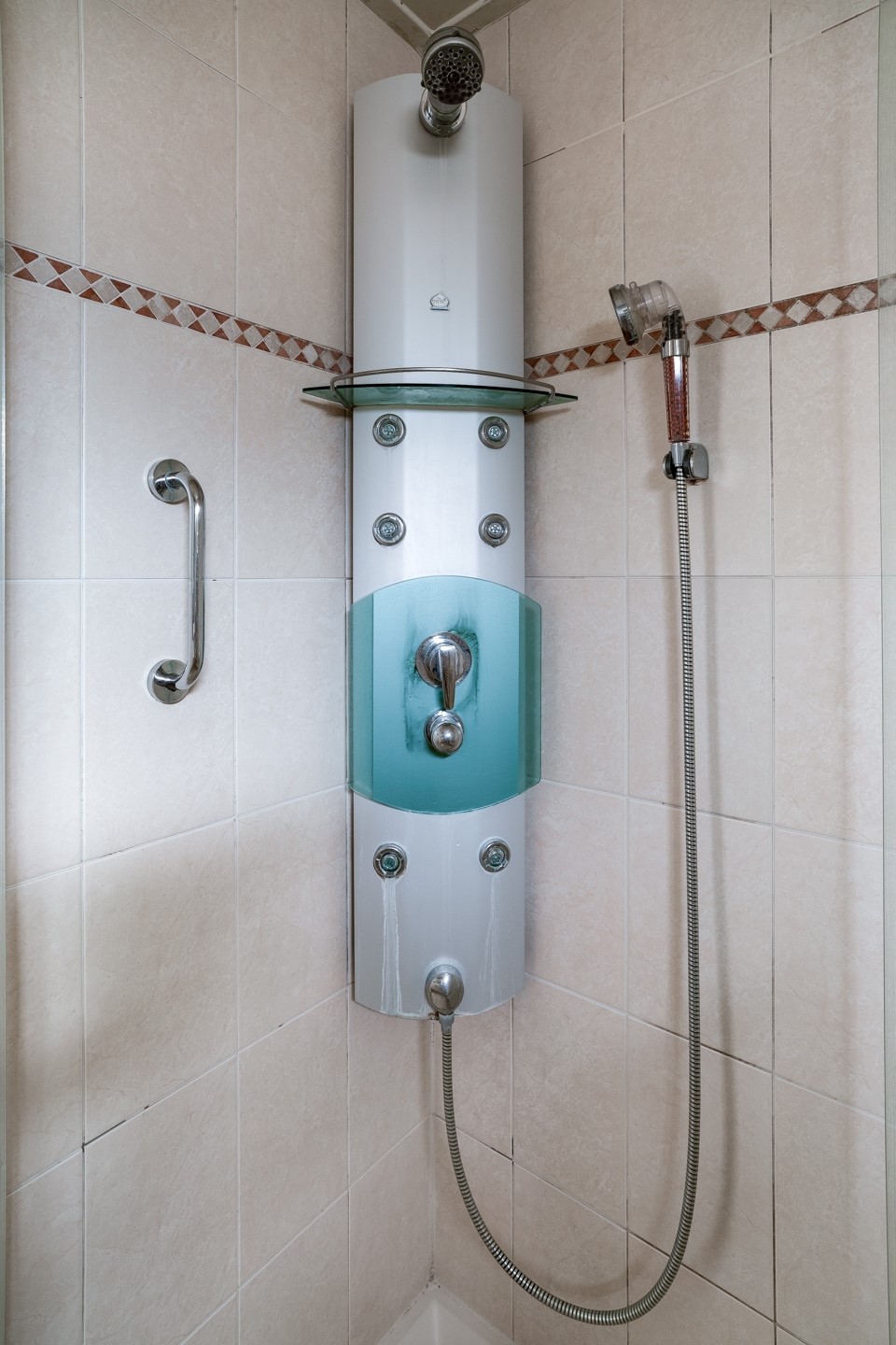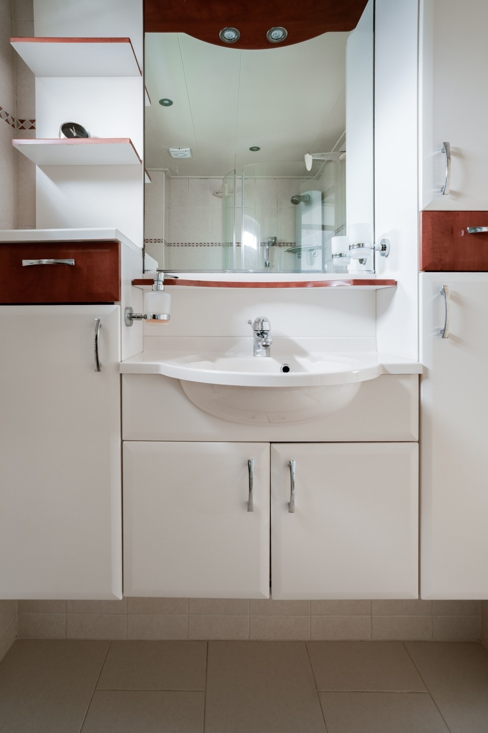 Overloop met toegang tot de drie slaapkamers, allen met rolluiken, één slaapkamer met airconditioning en één slaapkamer met wasmachine-/drogeraansluiting. Keurige badkamer aan de voorzijde met elektrische vloerverwarming, douchehoek, wastafel en tweede toilet.