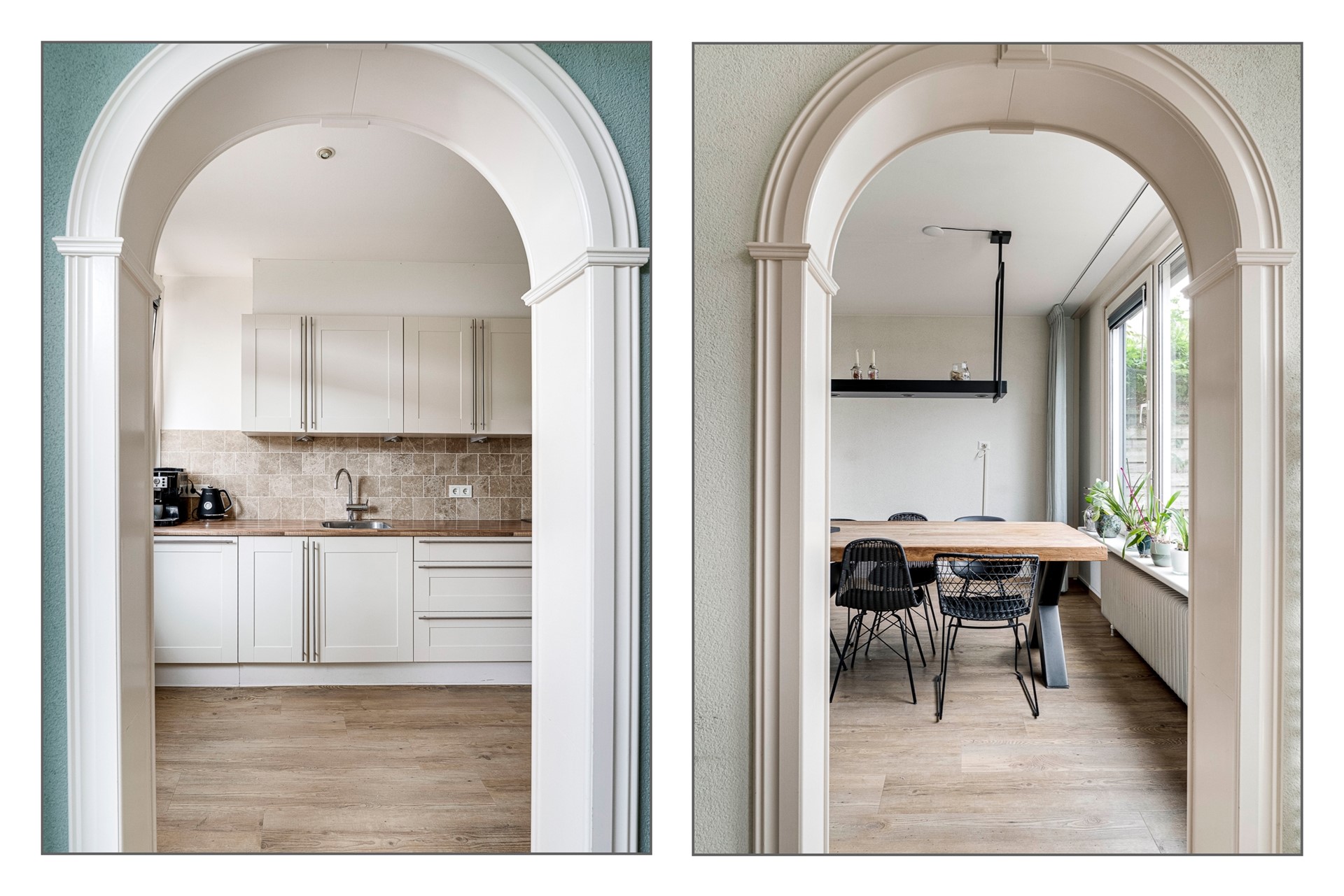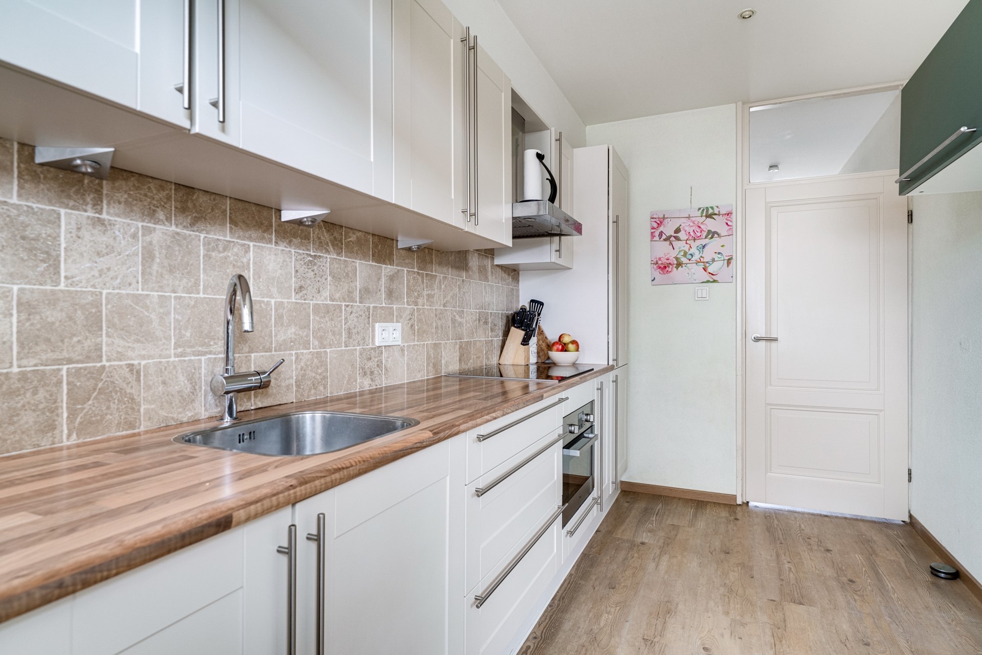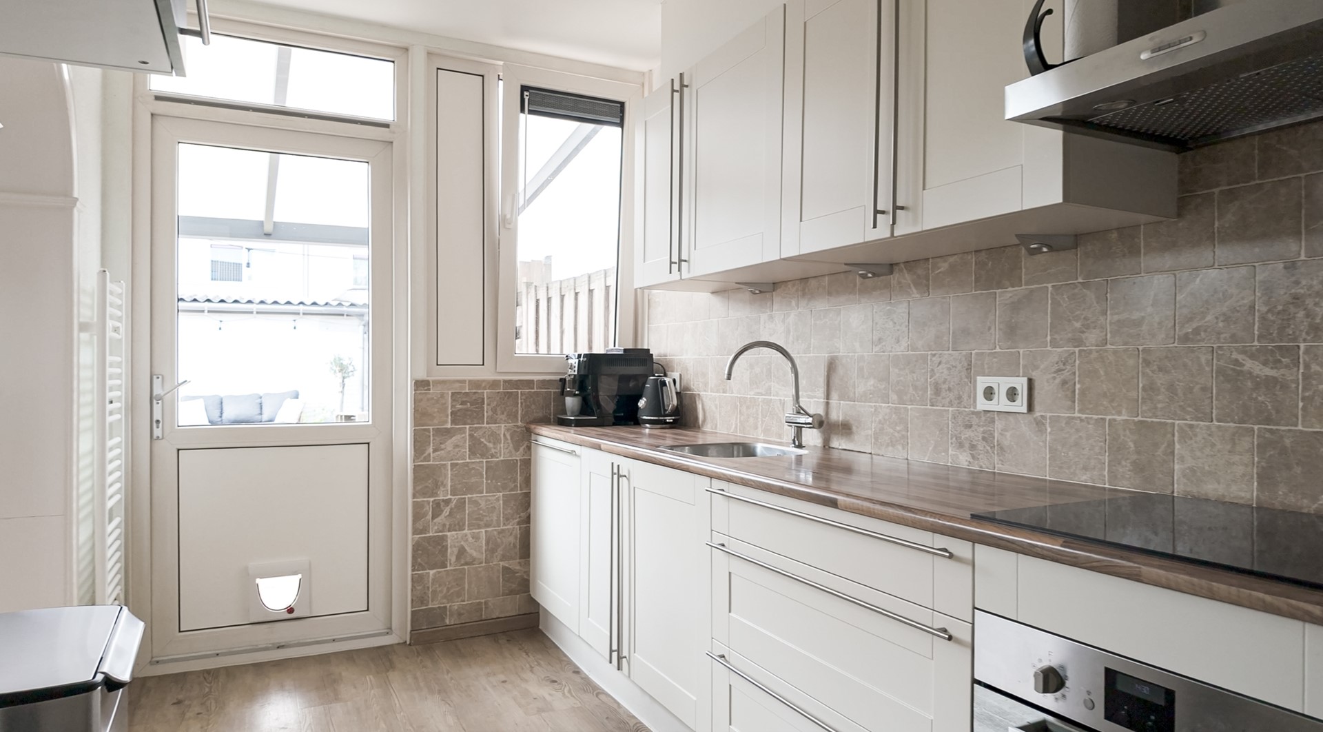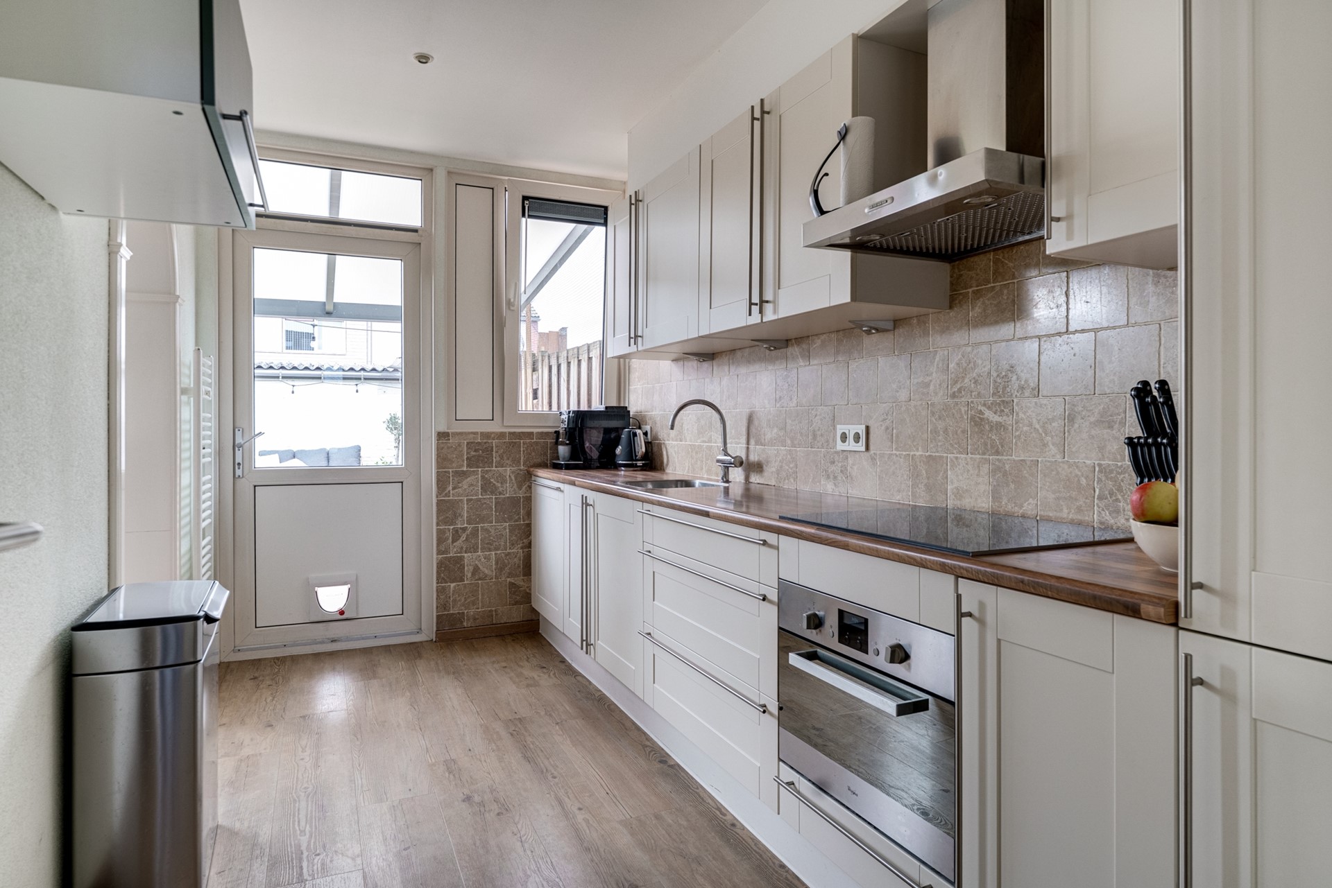 Entree via hal met meterkast, toilet en trapkast met toegang tot de kruipruimte. Lichte doorzonwoonkamer met glasvezelaansluiting en elektrische screens. Aan de achterzijde is de keurige keuken gelegen. De keuken is uitgerust met diverse inbouwapparatuur zoals een vaatwasser, combimagnetron, koel-vriescombinatie en 4-pits inductiekookplaat.