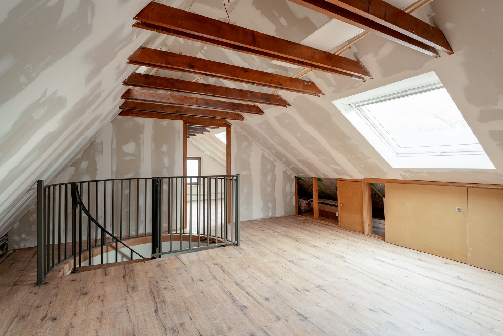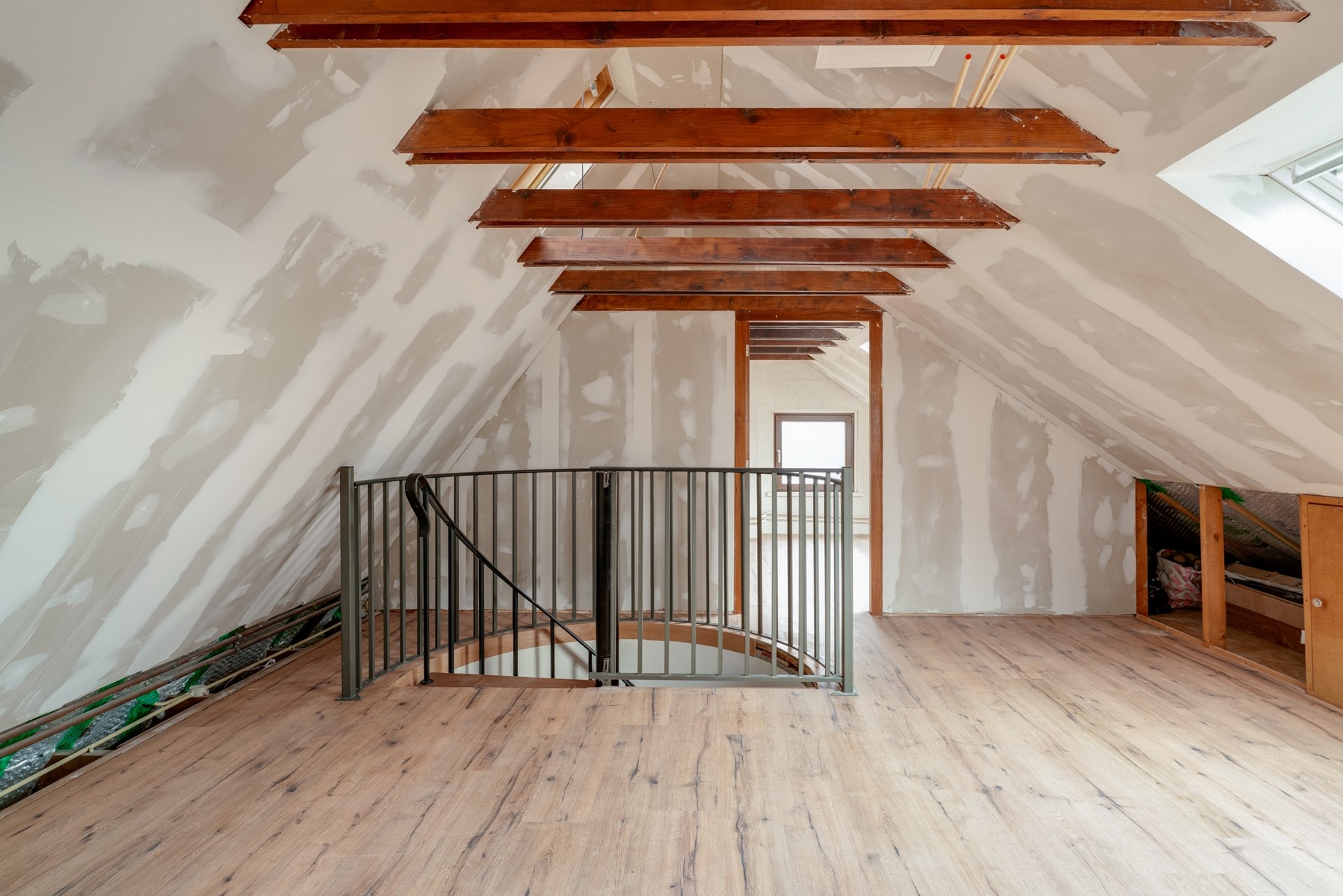 Tweede verdieping met vernieuwde kunststof dakramen. De tweede verdieping is momenteel opgedeeld in een ruime overloop en een vierde slaapkamer, maar biedt voldoende ruimte om een vijfde slaapkamer te realiseren.